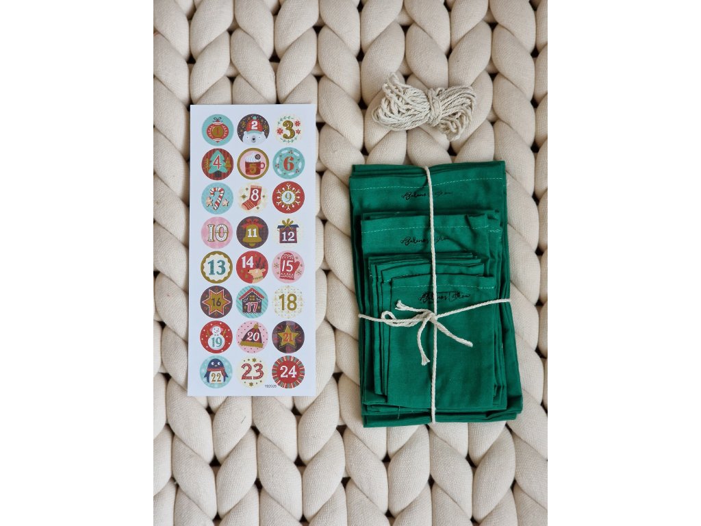 Spolu se sadou sáčků obdržíte macrame provázek o délce zhruba 5 metrů, ale sáčky můžete uzavřít i jinak. Pomocí dřevěného kolíčku zavěšených na provázek či světýlka, nebo libovolným provázkem co máte rádi, který jednoduše dokola obtočíte. Podívat se můžete i na naší nabídku provázků a klubíček. Součástí balíčku jsou také krásné samolepky s adventními čísly. Každá barevná varianta je doplněna o různé typy samolepek.